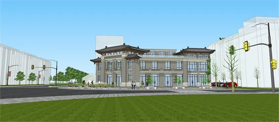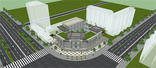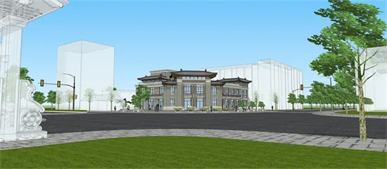 拟建胜园项目处于西大街与三胜街交叉口西北角,总占地面积1855.1㎡ ,总建筑面积约2137.0㎡,项目功能定位为商业及商务办公。建筑采用中西合璧的民国风形式,传统灰墙,白色罗马柱式,风格呈现独特的折衷效果。